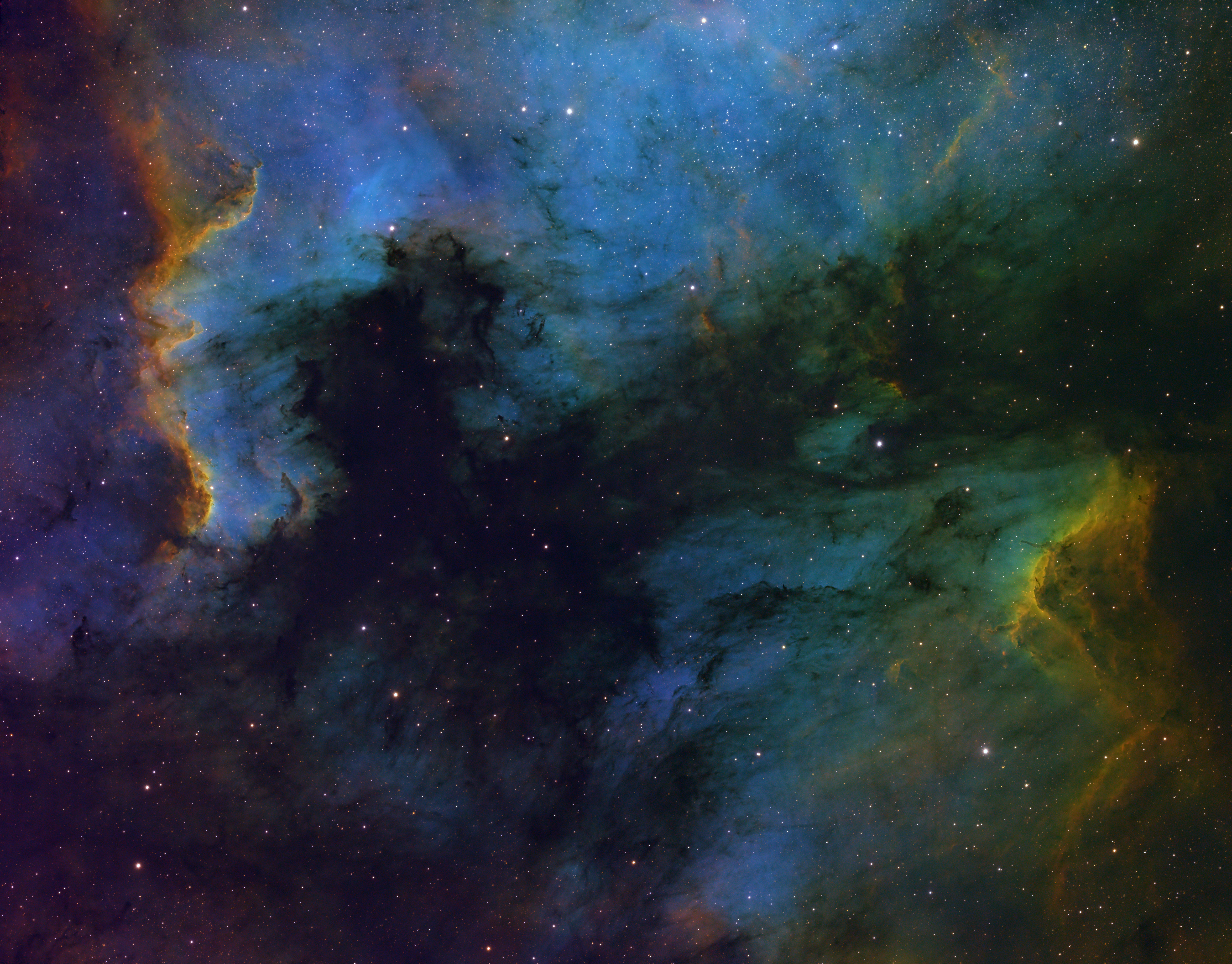 Der Nordamerikanebel (links) ist 2000 bis 3000 Lj. entfernt und besteht überwiegend aus Wasserstoff. Der Pelikan-Nebel (rechts) ist ebenfalls eine ausgeprägte Wasserstoff-Region. Zwischen den beiden Nebeln liegt eine riesige, bläulich leuchtende Sauerstoff-Wolke, die aber zum Teil von davorliegenden, dunklen Staubwolken verdeckt wird. Das Bild ist ein Mosaik aus zwei Teilen, aufgenommen im November 2022 in der SHO-Farbpalette. Gesamtbelichtungszeit: 20 Stunden