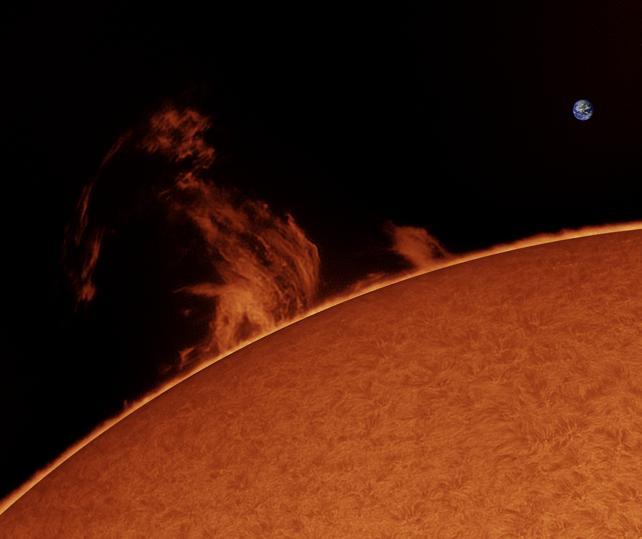 Noch einmal die große Sonnenprotuberanz. Diesmal ein Einzelbild der Serie vom Ende des Videos, um Details besser erkennen zu können. Auch die Sonnenoberfläche ist hier nun zu sehen. Rechts oben wurde maßstabsgetreu eine Abbildung der Erde eingefügt, um die Größe dieses Plasmausbruchs darzustellen. Die Eruption hat dabei eine Höhe erreicht, die in etwa dem 15-fachen Erddurchmesser entspricht.