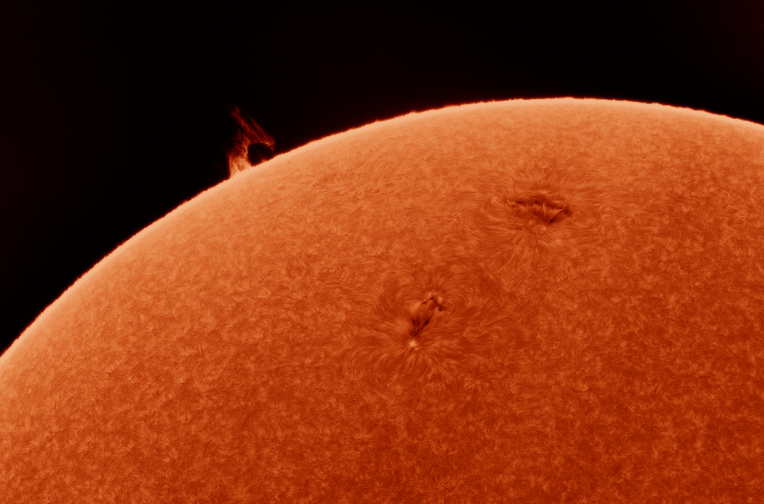 Sonne mit Sonnenflecken und Protuberanzen in Ha-Licht
