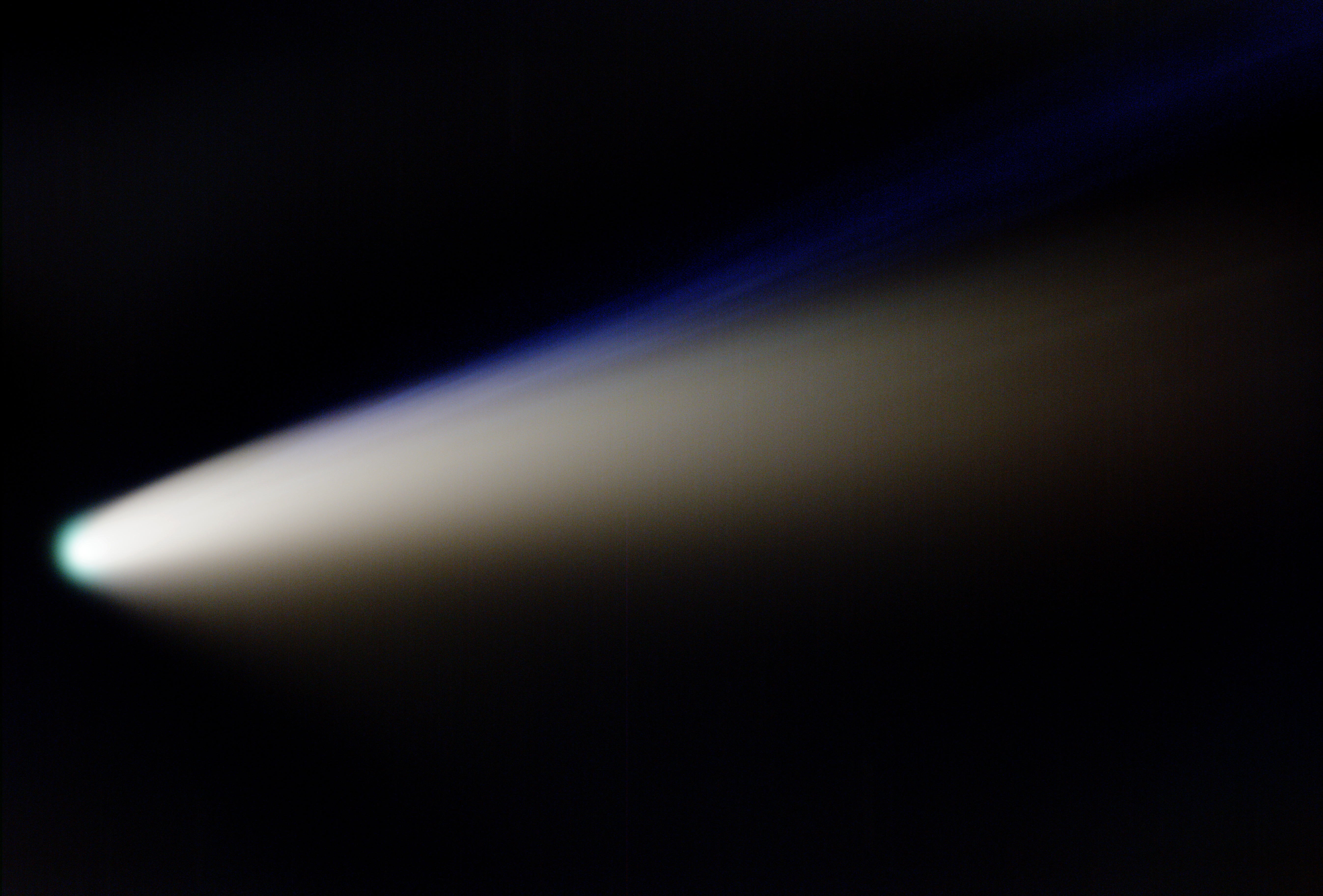 Noch einmal der Komet Neowise - diesmal mit dem Teleskop aufgenommen. Man erkennt, das der Komet einen weißen und einen blauen Schweif hat. Der weiße Schweif besteht aus Staubteilchen, der Blaue aus ionisiertem Gas.