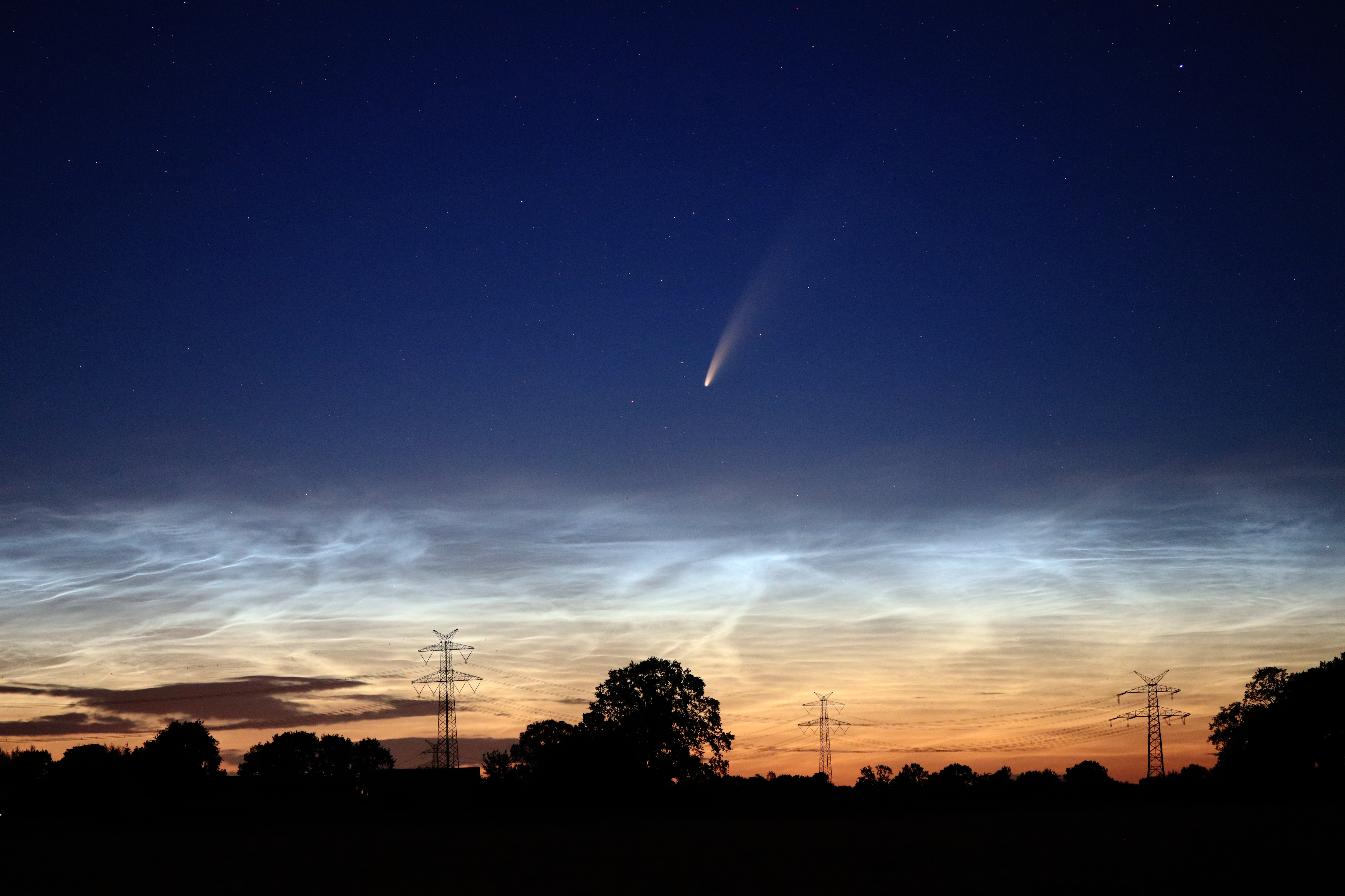 Diese Nachtaufnahme des Nordhimmels habe ich mit meiner DSLM-Kamera mit einem 60 mm-Objektiv gemacht. Sie zeigt den Kometen Neowise über leuchtenden Nachtwolken. Diese Wolken bestehen aus Eiskristallen und schweben in über 80 km Höhe. Deshalb werden sie noch einige Zeit von der schon längst untergegangenen Sonne angeleuchtet.