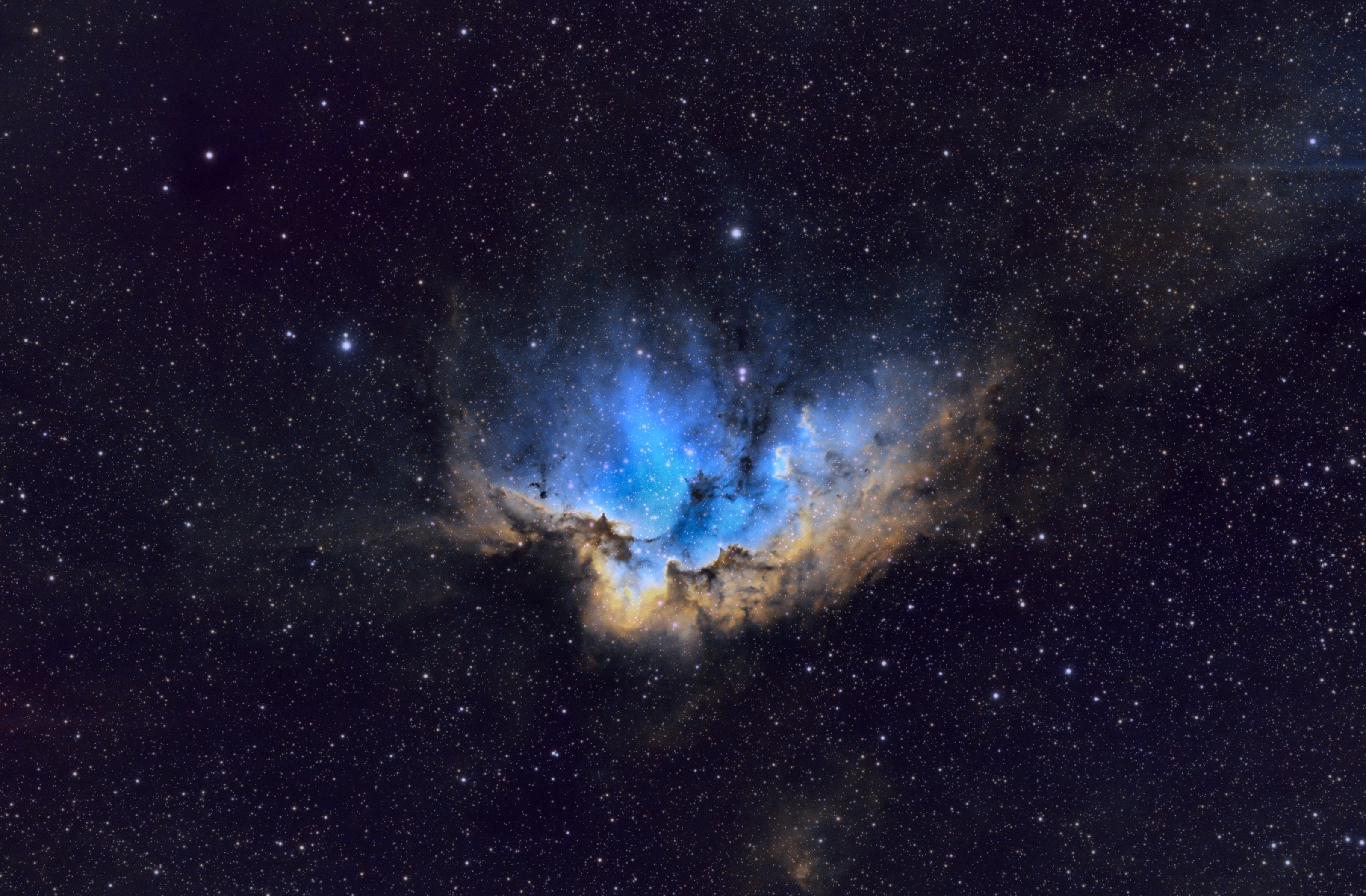 Der Wizard-Nebel, hier in der SHO-Farbpalette aufgenommen, ist ein Emissionsnebel im Sternbild Kepheus, in dem ständig neue Sterne entstehen. Belichtungszeit: 3,7 Stunden