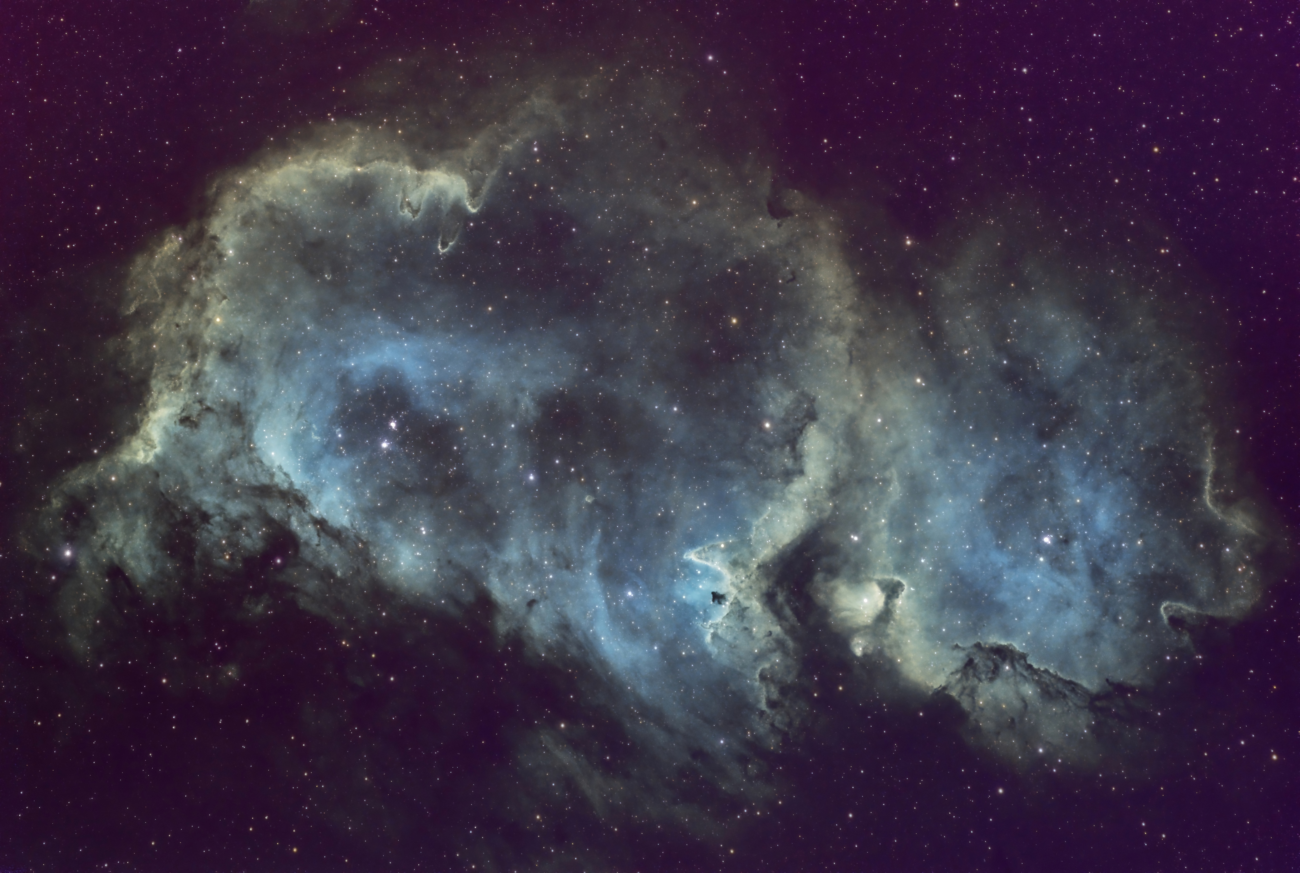 Der Seelennebel ist ein 7500 Lj. entfernter Emissionsnebel mit eingebetteten, kleinen offenen Sternhaufen. Die zumeist jungen, stark strahlenden Sterne darin ionisieren die Gase des Nebels und regen ihn somit zum Leuchten an. Aufgenommen in der SHO-Farbpalette im März 2022. Belichtungszeit: 8,4 Stunden
